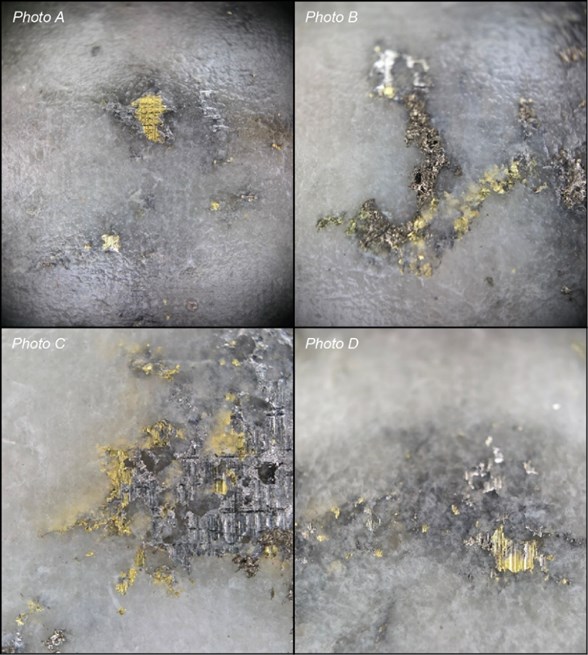 Photo 2. Photos of coarse visible gold and bismuthinite from a ~10 cm wide vein in drill hole ALT-25-012 (287.32 - 288.24 m).