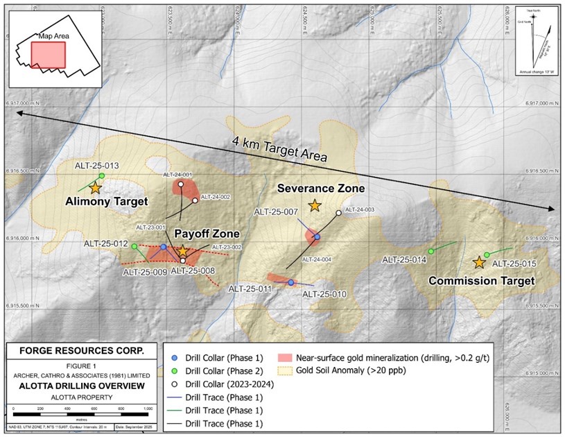 PJ Murphy, CEO of Forge Resources, states: "We are extremely excited by the exceptional high-grade gold results from hole ALT-25-012, which returned 105 g/t Au over 1.25 metres. This intercept highlights the strong high-grade gold potential at Alotta and complements the broader, bulk-tonnage style mineralization at the Payoff Zone. The consistently strong gold grades and wide mineralized intervals encountered to date further confirm the strength, continuity, and scale of this growing gold system, which begins right at surface. Multiple instances of visible gold within quartz veining underscores the robustness of this mineralized corridor. As we advance exploration, the Company will prioritize several large 'bull's-eye' targets defined by coincident copper, gold, and molybdenum soil anomalies and supporting geophysical signatures. We look forward to receiving the multi-element results from the rushed samples of hole ALT-25-012, along with the remaining assays from our Phase 2 drilling program."