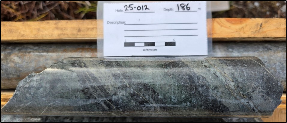 Photo 3. Quartz-pyrite veins with strong chlorite-sericite alteration halos (Alt-25-012, 186 m depth).