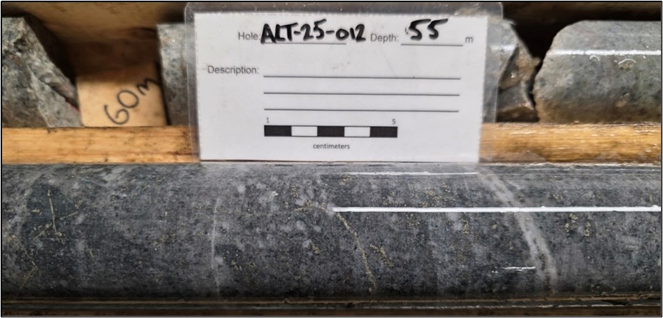 Gold analysis from rushed samples from drill hole ALT-25-012, at the Payoff Zone, have returned 105 g/t Au over a core length of 1.25 m. Photos 1-2 are from a section of the drill core hosting visible gold. The true width is not known, the contacts ranging from 10-35 degrees to core axis.