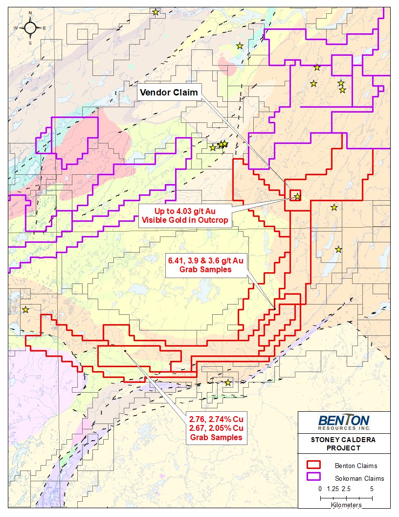 The Property is important as Benton's current Stoney Caldera land position surrounds the acquired parcel and is host to a previously discovered gold zone containing visible gold in outcrop that assayed 4.03 g/t gold (Au) (see Aurwest Resources Corporation news release dated December 12, 2022). A recent visit by Company personnel has confirmed the presence of widespread quartz flooding in a felsic intrusive unit, the Company has sampled multiple mineralized areas of quartz and submitted them for assay, the results will be released when received.