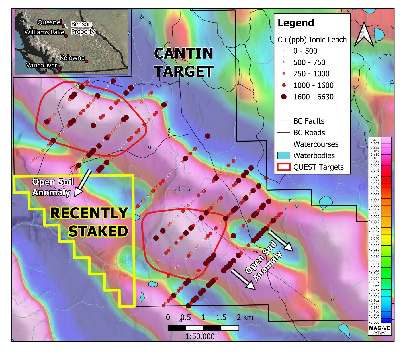 Figure 1. Map of the Cantin area showing open copper anomalies, QUEST targets, and the recently acquired mineral claim covering a continuation of coincident soil and geophysical anomalies.