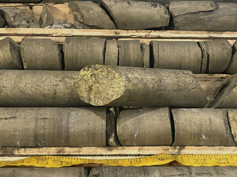 - Massive copper bearing sulphides (VMS — Cu-Pb-Zn-Ag-Au) were found associated with the contact breccia at 139m depth with a second zone of massive copper bearing sulphides (VMS — Cu-Pb-Zn-Ag-Au) intersected at 155 meters, having an approximate true width of 20 meters.