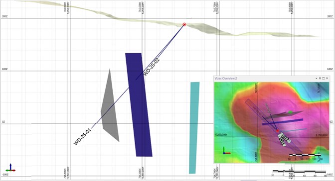 - DDH WD-25-02 was collared on the same drill pad as WD-25-01 and drilled at an azimuth of 310 degrees and a dip of -50 degrees to intersect the first plate approximately 50 meters west of Hole WD-25-01, increasing the mineralized zone along strike, to the west. (Figure 3). The hole completed at 203m at depth.