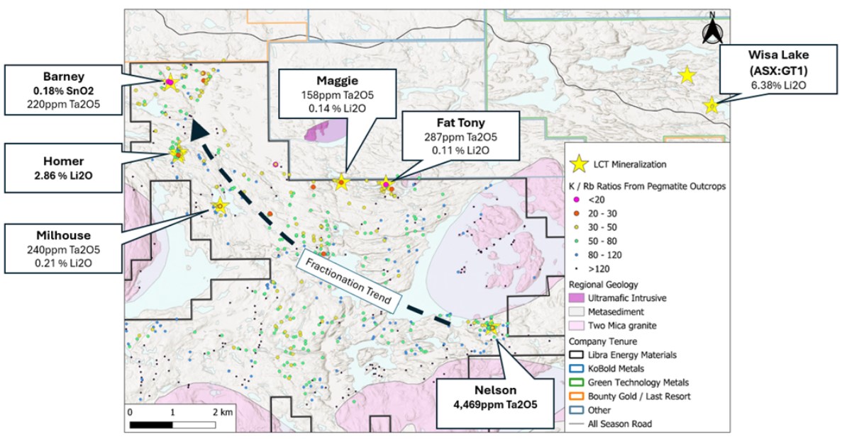 A comprehensive exploration program was carried out at the SBC project during the 2025 field season, which included LiDAR, high-resolution Heli-GT magnetic survey, HyperPod survey (KoBold's proprietary airborne geophysical data-collection platform), and helicopter-supported prospecting and mapping. During the field program, completed in July 2025, a total of 74 geochemical samples were collected along with 274 outcrop examinations, resulting in the discovery of two new spodumene-bearing pegmatites (Figure 2). The two new spodumene-bearing pegmatites returned values up to 2.08% Li2O and 468 parts per million (ppm) tantalum pentoxide (Ta2O5) along with 1.03% Li2O, respectively. The mapping focused on both previously discovered spodumene occurrences (see the Company's press release dated December 2, 2024) as well as the newly discovered occurrences to characterize the pegmatites. Sampling across the property identified both a northern and southern east-west trend of highly fractionated pegmatites, with potassium / rubidium ("K/Rb") ratios locally as low as six from whole-rock samples along with elevated caesium (Cs) values. Spodumene mineralization generally occurs within pegmatites with K/Rb ratios between 15-25, though mineralization has been observed in samples with ratios as high as 45. Individual occurrences range from isolated pegmatites to closely stacked spodumene-bearing pegmatites. The pegmatites are a simple albite-spodumene type, appear to lack other types of lithium mineralization (e.g. petalite, lepidolite, etc), and are generally weakly zoned with very coarse-grained white to light buff in colour.