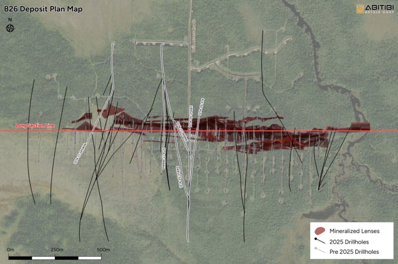 Jonathon Deluce, CEO of Abitibi Metals, commented: "These Phase 3 results provide confirmation of the strength, continuity, and scale of the high-grade Western Down-Plunge extension at B26. The consistency of these intercepts continues to exceed expectations and further reinforces our confidence in the significant growth potential of this highly valuable zone. With strong momentum now established, our Phase 4 drill program is underway and fully focused on this priority area as a driver of value creation. Two drill rigs are currently active, with a third scheduled to come online in February, as we execute a targeted 40,000-metre drill campaign designed to rapidly expand the deposit."