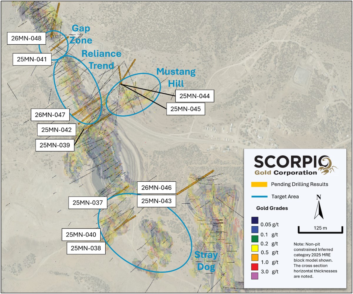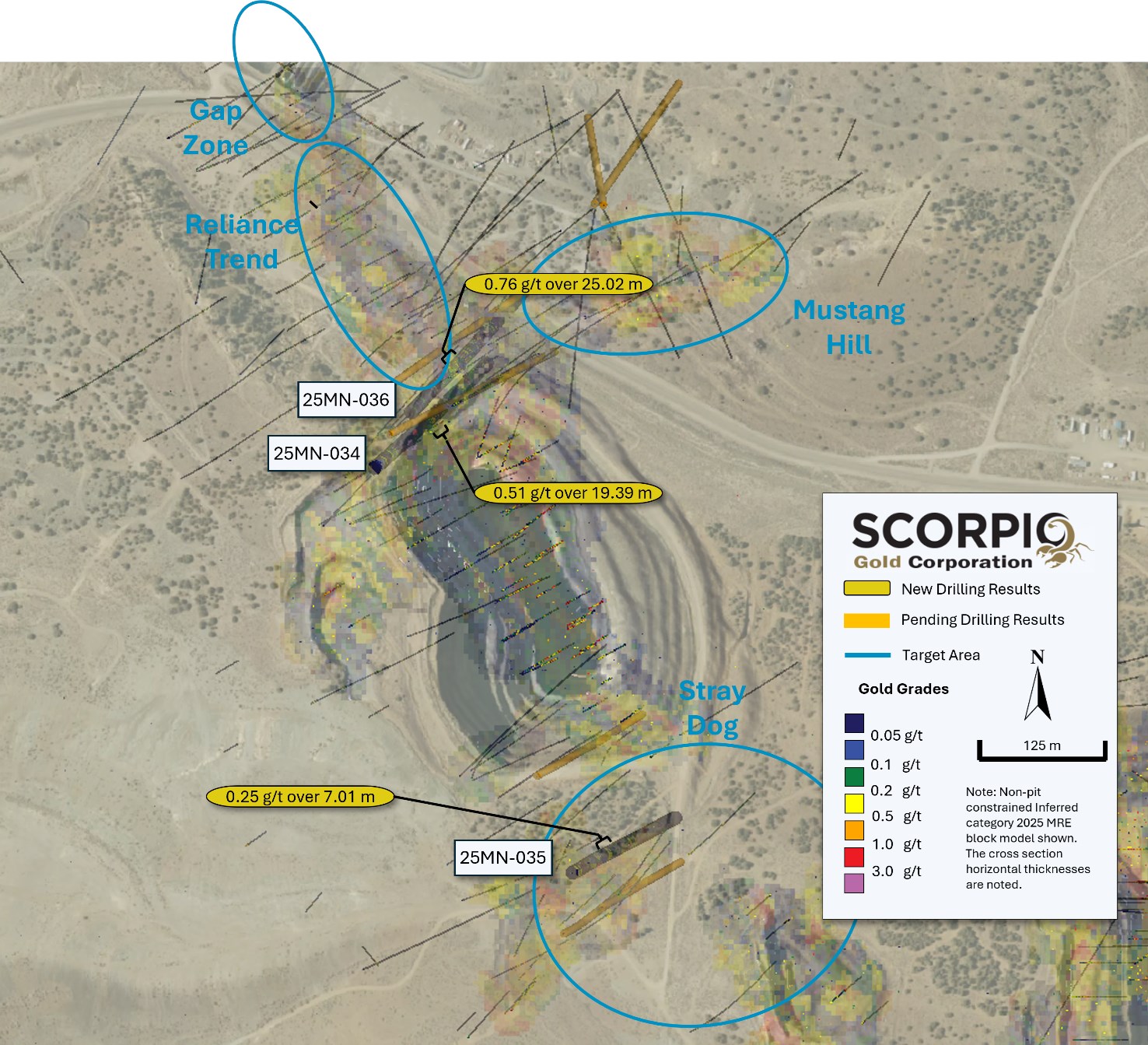Two holes were drilled along the Reliance Trend (25MN-034 and 25MN-036), one hole was drilled at the southern end of the West Pit (25MN-035), see Figure 1. These holes tested laterally and below the Inferred Resource Constraining Pit ("IRCP"), modelled at a gold price of US$2,500 with a 0.3 g/t gold only cutoff grade, along with other inputs including: mill recovery of 90%, 50 degree pit slope angle for in-situ rock, mining costs of $3.00 per tonne for both ore and waste, milling costs of $15.00 per tonne processed, general administration cost of $3.50 per tonne processed and 2% royalty costs, and ore loss and dilution not applied. For further details see "Mineral Resource Estimate and NI 43-101 Technical Report, Manhattan Property, Nye County, Nevada" with an effective date of June 4, 2025, on Scorpio Gold's website, here.