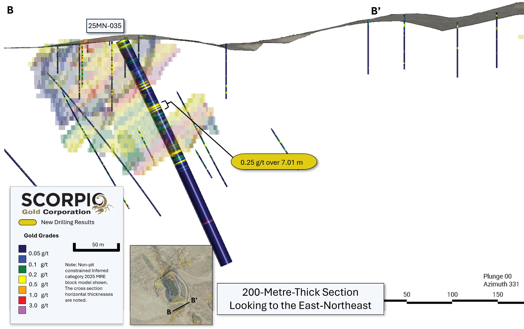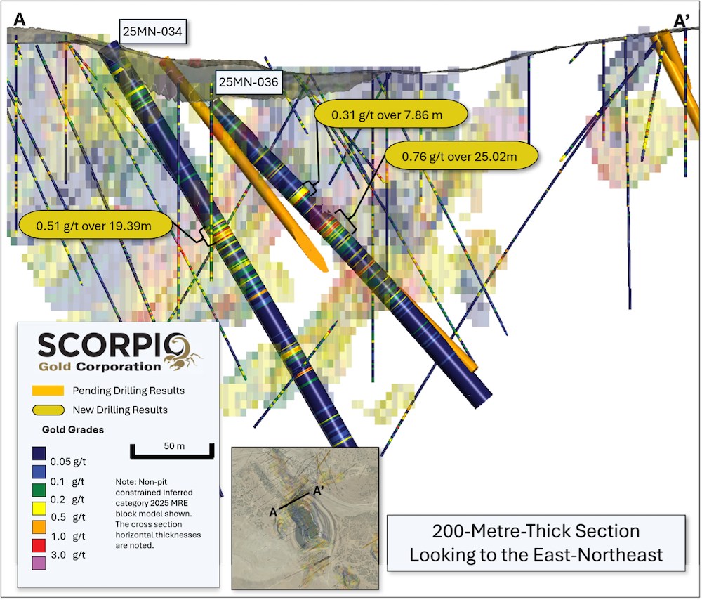 Vancouver, British Columbia--(Newsfile Corp. - January 23, 2026) - Scorpio Gold Corp. (TSXV: SGN) (OTCQB: SRCRF) (FSE: RY9) ("Scorpio Gold", or the "Company") is pleased to announce results from three holes from its 2025 drilling program at the Manhattan District Project ("Manhattan"), Nevada, USA: from the Phase Two program (25MN-034 through 25MN-036). The results are tabulated in Table 1 and discussed below. Scorpio Gold has drilled 38 drill holes to date from its Phase Two diamond drilling program, 25MN-011 through 25MN-045 and 26MN-046 through 26MN-048, for a grand total of 11,906 m. With the results herein, Scorpio Gold has reported assays on 26 of these (25MN-011 through 25MN-036), totalling 8,584 m, and assays are pending from 12 holes (25MN-037 through 25MN-045 and 26MN-046 through 26MN-048), totalling 3,322 m. The pending results will be reported as they come available and the holes are discussed briefly below.