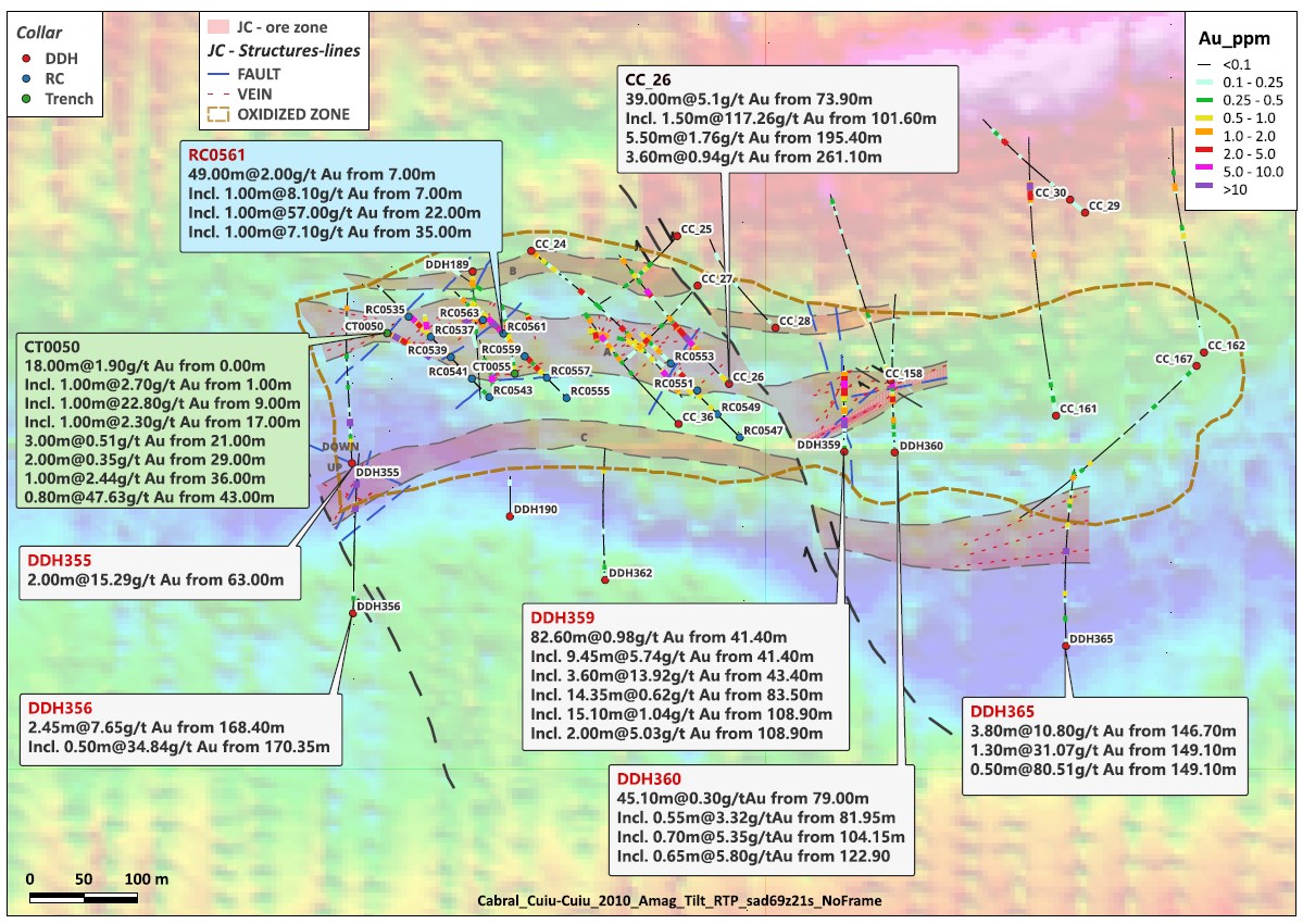 Alan Carter, Cabral's President and CEO, commented, "The Jerimum target is emerging as an important discovery at Cuiú Cuiú. These latest drill results are very encouraging and significant for two reasons: Firstly, they extend the main E-W trending mineralized zone by at least 175 meters to the east where it remains open and extends the current known strike length of the main zone to 750 meters. Secondly, the presence of several previously unrecognised narrow high-grade structures intersected in two reconnaissance holes drilled 600 meters apart and immediately south of the main mineralized zone, is also highly encouraging and augers well for the calculation of an initial resource in the primary material at Jerimum Cima.