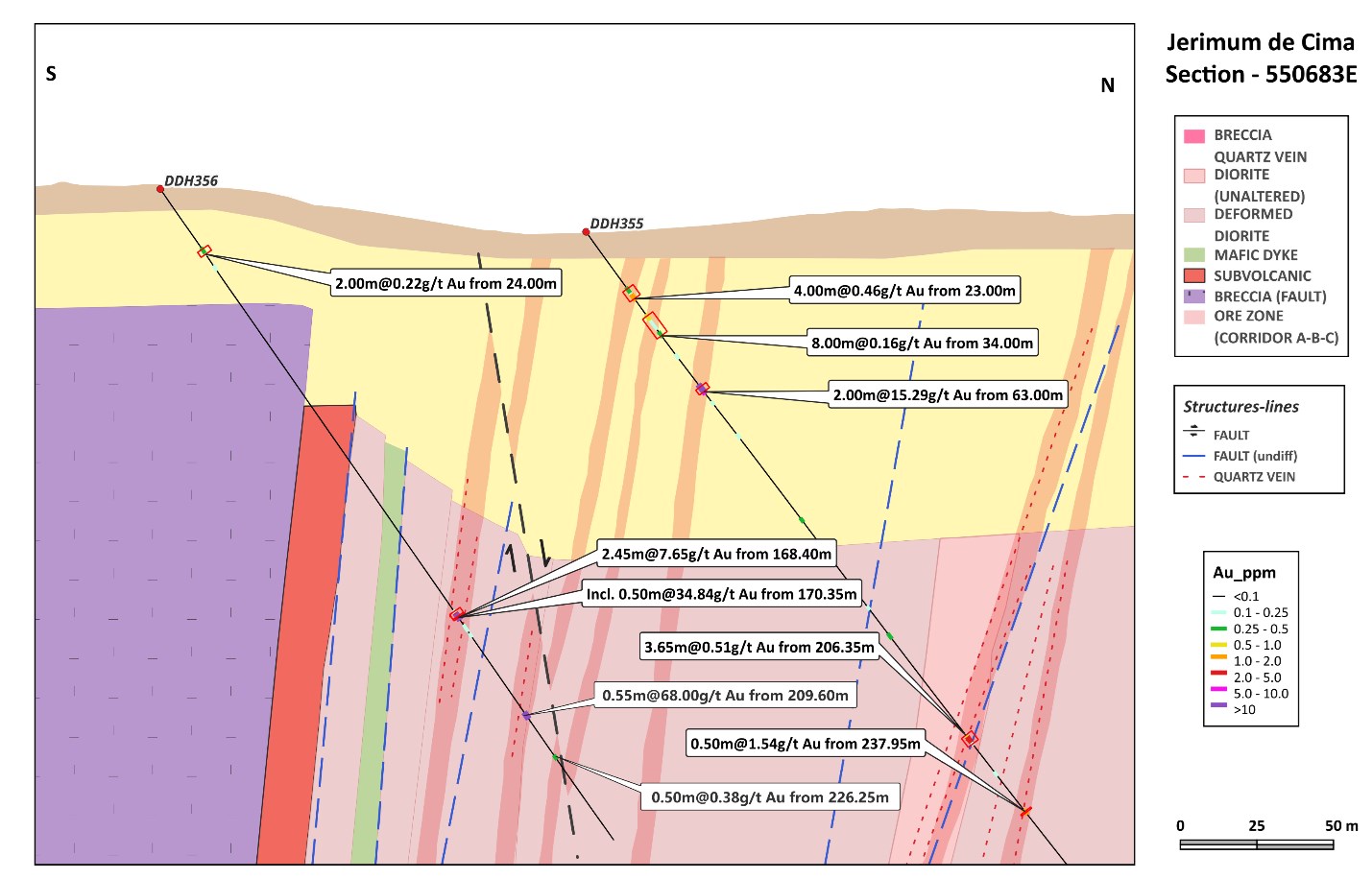 Figure 3: Cross section showing section 550683E at the Jerimum Cima discovery showing results from DDH355 and DDH356. DDH355 cut a previously unrecognised zone of high-grade mineralization 125m south of the main E-W trending mineralized zone at Jerimum Cima. The mineralized zone remains open to the east and west and down-dip. True widths may be 50% of actual drill intercepts. Terms: g/t = grams / tonne, m = metres, Au = gold