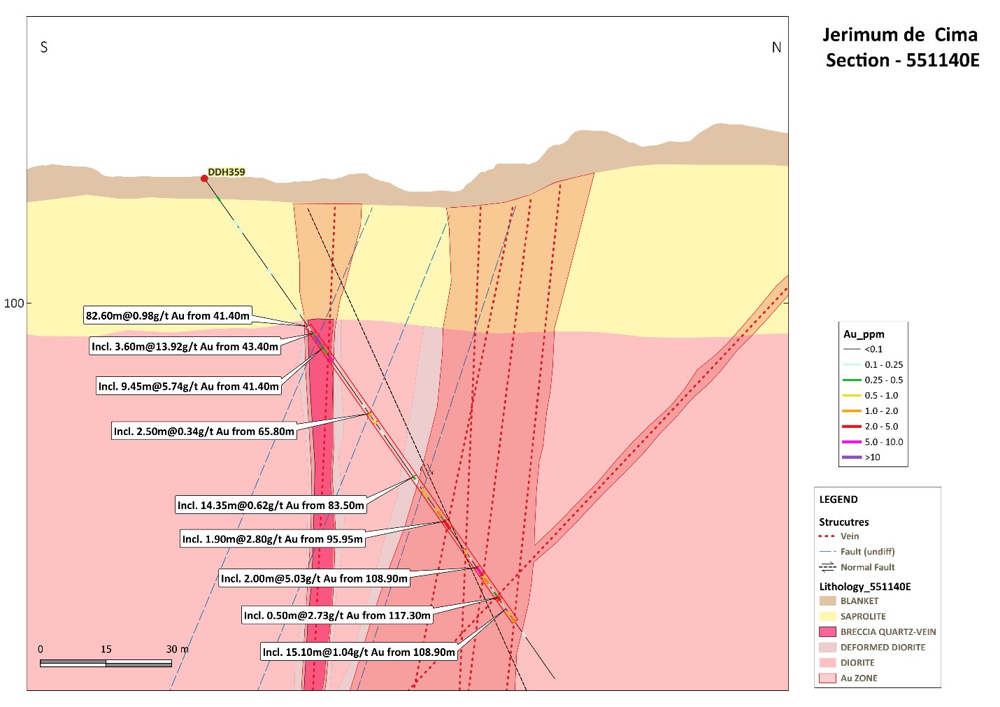 Figure 4: Cross section showing section 551140E at the Jerimum Cima discovery showing results from DDH359 which returned 9.5m @ 5.74 g/t gold, 14.4m @ 0.62 g/t gold and 15.1m @ 1.04 g/t gold and extends the main mineralized zone at Jerimum Cima towards the east. True widths may be 50% of actual drill intercepts. Terms: g/t = grams / tonne, m = metres, Au = gold