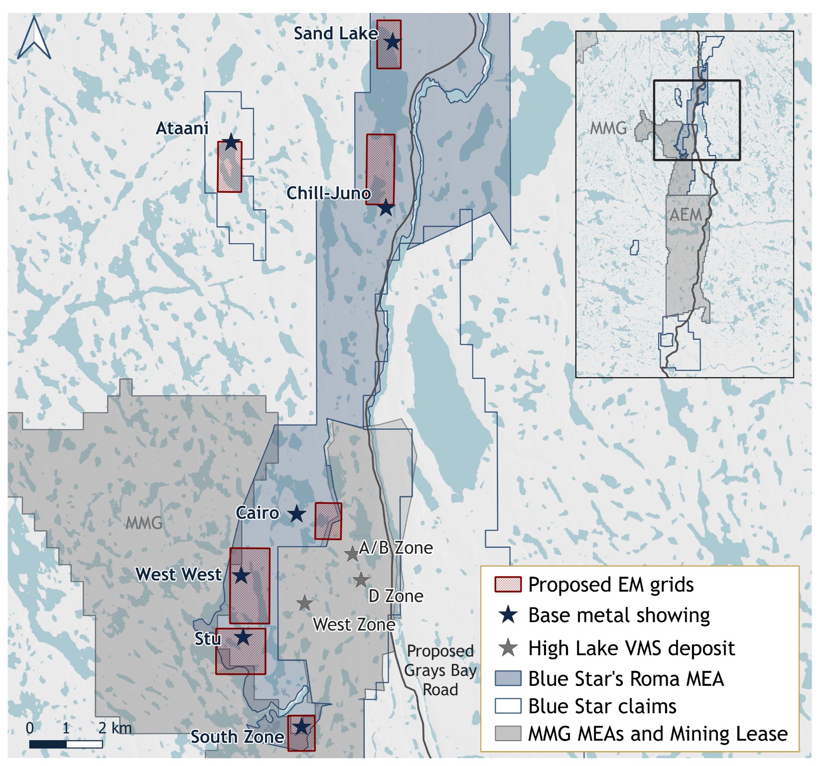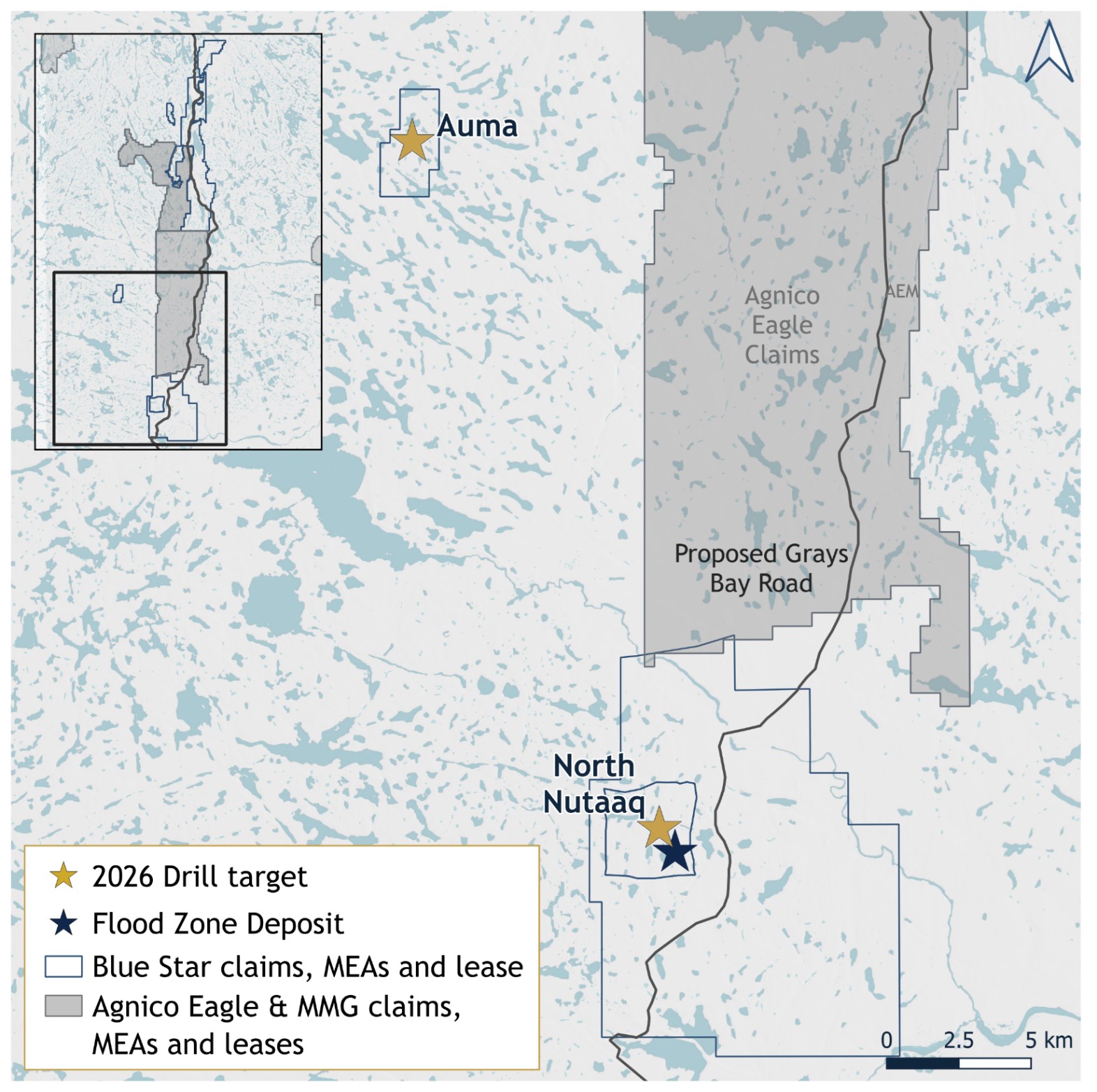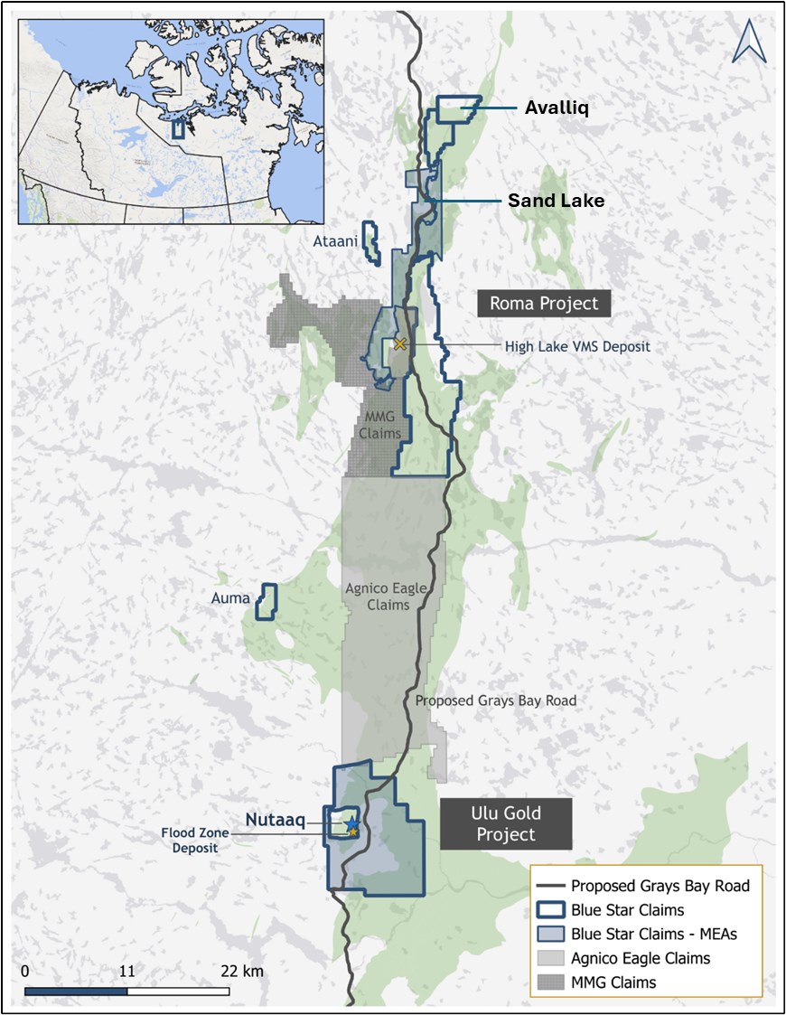 Blue Star Gold Corp. is a mineral exploration and development company focused on Nunavut, Canada. The Company controls over 300 square kilometres of highly prospective and underexplored mineral properties in the High Lake Greenstone Belt. Its principal assets include the Ulu Gold Project - comprised of the Ulu Mining Lease and Hood River Property and the Roma Project. The Ulu Mining Lease hosts the high-grade Flood Zone Gold Deposit, and the Company's broader land package contains numerous high-priority gold and critical mineral targets, providing substantial upside potential for resource expansion. Blue Star's projects are strategically located 40-100 km south of the proposed Grays Bay deep-water port, with the planned all-weather Grays Bay Road corridor passing near both the Roma and Ulu Gold Projects.