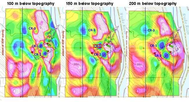 While the upper portion of CR1 coincides with the historic and current underground mine workings including the Big Dog and Goldilocks mineralized zones that will be initially targeted for mining operations upon receipt of the Operating Permit, the analysis shows the low-resistivity features extend at least 840 m (2755 ft) above sea level ("ASL") and 97 m (320 ft ) above the current mine workings at the main portal level of 707 m (2320 ft) and extending down to 200 m (656 ft) below the main portal and 507 m (1663 ft) above sea level as shown below in figures 1 (above current planned mining level), 2 (current planned mining level) and 3 (below current planned mining level).