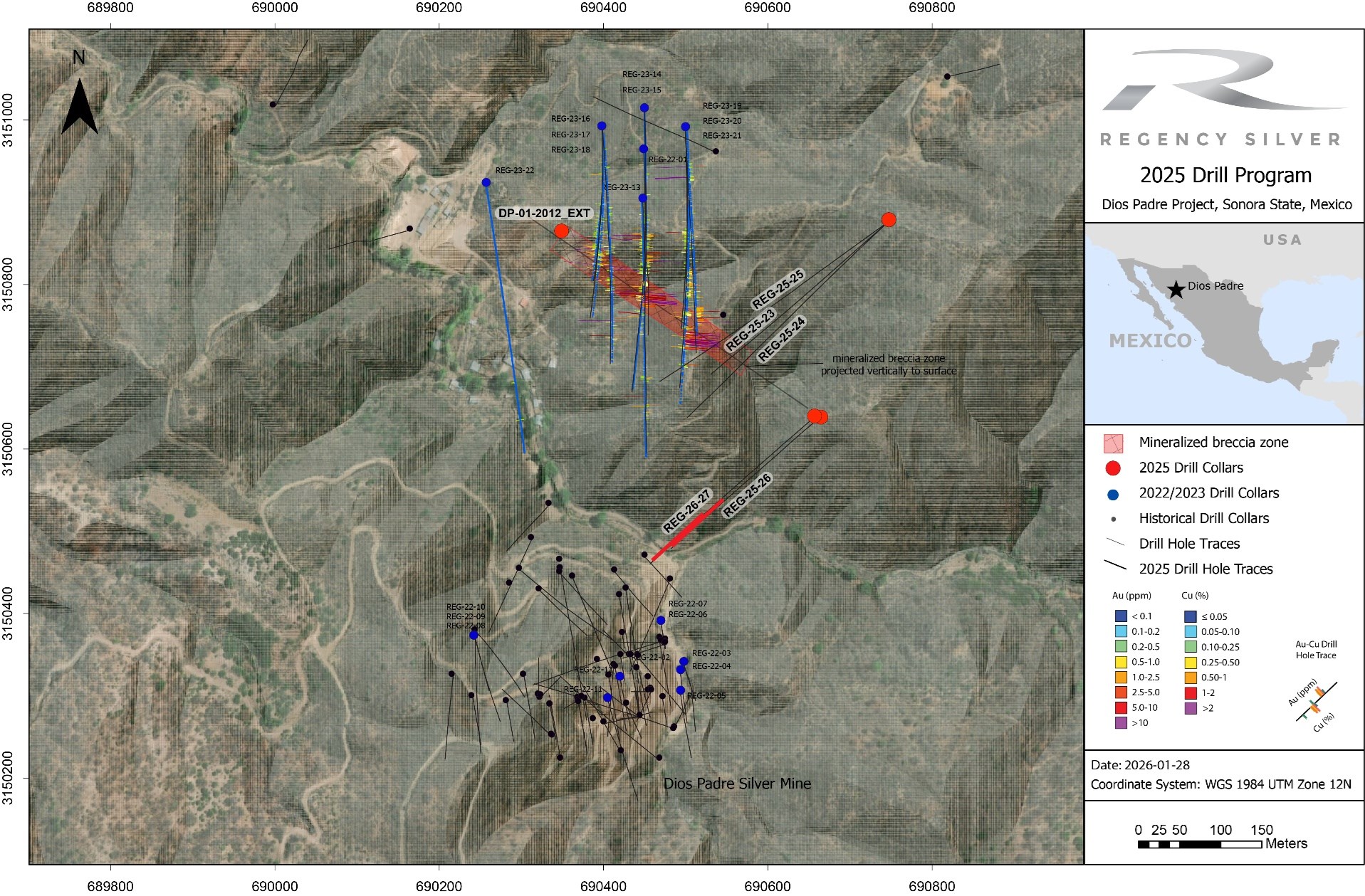 Vancouver, British Columbia--(Newsfile Corp. - January 28, 2026) - Regency Silver Corp. (TSXV: RSMX) (OTCQB: RSMXF) ("Regency Silver" or the "Company") is pleased to announce that the first hole of its ongoing 2026 drill program at its Dios Padre project in Sonora, Mexico has intersected sulphide-specularite supported breccia in multiple zones across a broad, non-continuous ~250m interval (Figure 1). Hole REG 26-27 was drilled 50m above hole REG-25-26 and intersected mineralization ~100m down-dip below the historic Dios Padre silver mine workings and ~275m up dip from drill hole REG-25-25 (Figure 2). Previously drilled holes REG 23-21 yielded 38m of 7.36 g/t gold, REG-22-01 yielded 35.8 metres of 6.84 g/t gold, 0.88% copper and 21.82 g/t silver, and REG 23-14 yielded 29.4 m of 6.32 g/t gold.