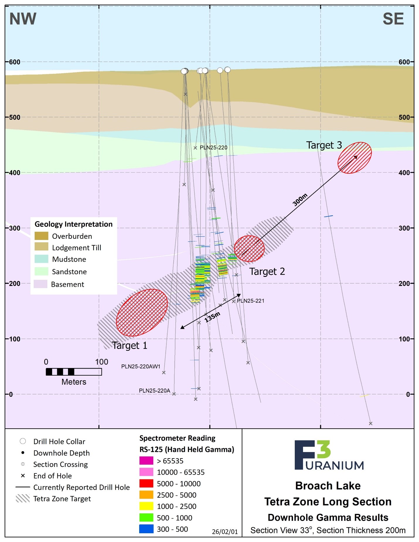 This news release also refers to neighboring properties in which F3 Uranium has no interest, and the Qualified Person has been unable to verify the information from those properties. Mineralization on those neighboring properties is not necessarily indicative of mineralization on the PLN Project.