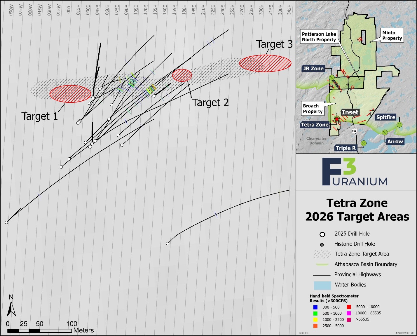 Kelowna, British Columbia--(Newsfile Corp. - February 3, 2026) - F3 Uranium Corp (TSXV: FUU) (OTCQB: FUUFF) (FSE: GL7) ("F3" or "the Company") is pleased to announce the commencement of the winter drill program at its 100% owned Broach Lake Property, on the recently discovered high-grade Tetra Zone (see NR July 7, 2025), located just within the south-western edge of the Athabasca Basin 12km northwest of Paladin's Triple R and 16km west-northwest of NexGen Energy's Arrow high-grade uranium deposits.