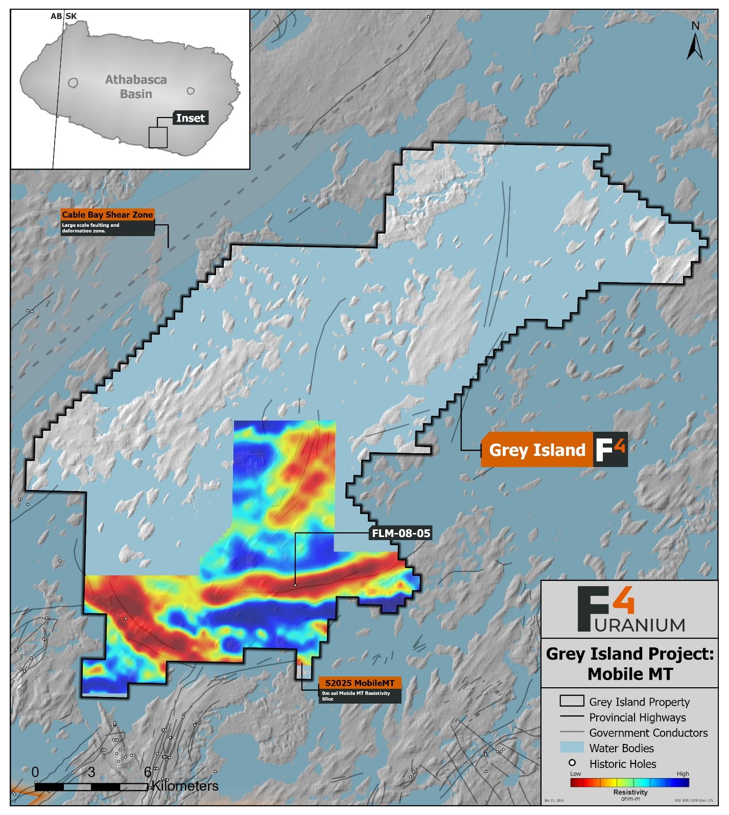 Kelowna, British Columbia--(Newsfile Corp. - February 3, 2026) - F4 Uranium Corp (TSXV: FFU) ("F4" or "the Company") is pleased to announce that an airborne Mobile Magnetotellurics (Mobile MT) survey over the Grey Island Project in the southern Athabasca Basin has yielded very favorable geophysics results indicating multiple large scale linear resistivity features (Figure 1) which represent prospective corridors and provide promising target areas. The Grey Island Project is located 70km to the west of the Key Lake Mine owned by Cameco and Orano and 60km to the east of Cameco's Centennial uranium deposit.
