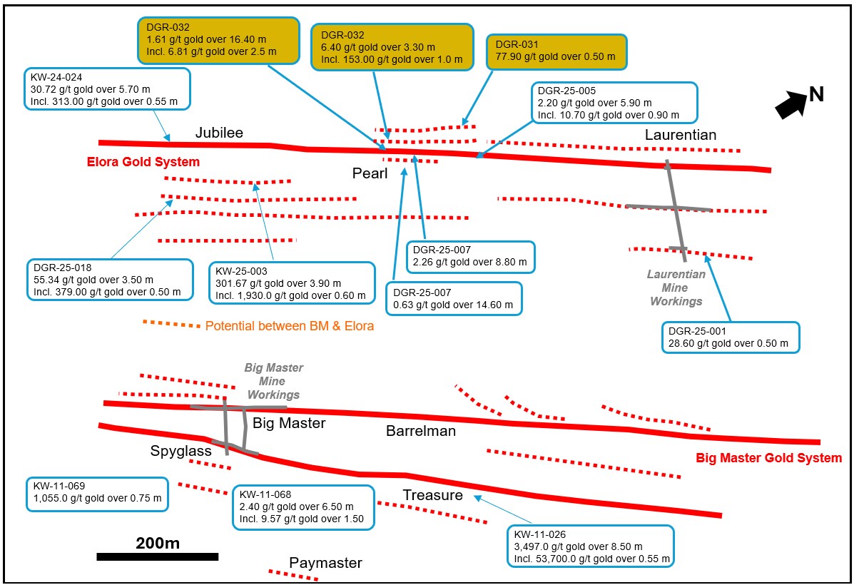 Vancouver, British Columbia--(Newsfile Corp. - February 4, 2026) - Dryden Gold Corp. (TSXV: DRY) (OTCQB: DRYGF) (FSE: X7W) ("Dryden Gold" or the "Company") is pleased announce new drill results which tested the Pearl zone in the Gold Rock Target Area. Results show continued expansion of the mineralization at Gold Rock with the discovery of two new footwall zones parallel to the main Elora shear structure at Pearl. (Figure 1). This is the first significant mineralization discovered in the footwall of the Elora Shear at Pearl establishing another high-grade exploration target at Gold Rock (link to video). Further interpretation of existing data and this new drilling has revealed a second high-grade pod on the main Elora shear zone. Dryden Gold drilled five new holes totaling approximately 1,600 meters testing along the 600-meter strike length from Jubilee to Pearl. (Figure 2) The highlighted intercepts are near surface from 15 to 70 meters vertical depth.