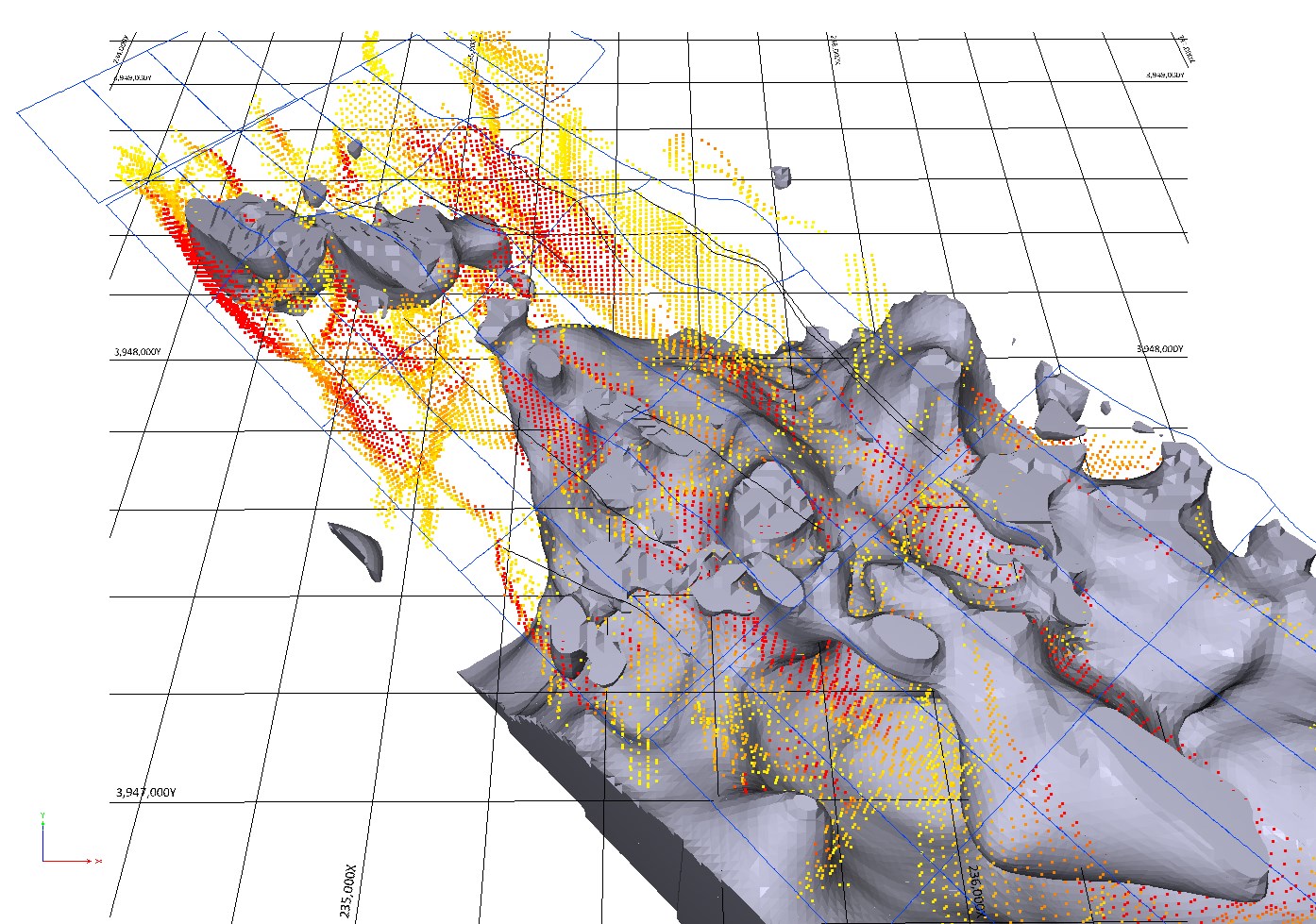 Figure 1: Three-dimensional magnetic vector inversion (MVI) visualization showing northwest-north-northwest (NW-NNW)-trending magnetic features derived from edge detection of the magnetic data. A 0.4 isosurface of the remanent magnetization component highlights a remanently magnetized NW-trending magnetic feature spatially associated with the mapped vein system.
