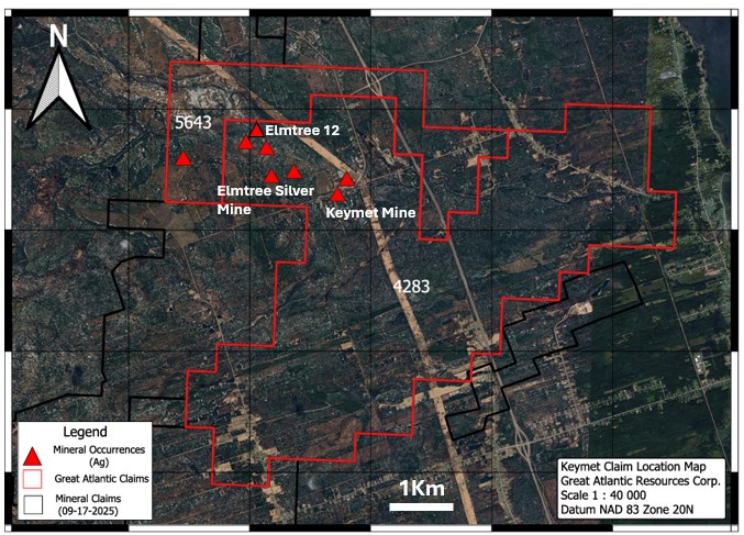 Additional Silver-Bearing Occurrences: Five additional mineral occurrences with reported silver are reported within the northern region of the Keymet Project. These include (with reference numbers as per the New Brunswick Department of Natural Resources and Energy Development Mineral Occurrence Database) Elmtree 2 (114), Elmtree 6 (110), Elmtree 14 (834), Keymet 3 (921) and Madran Northeast (1513). At the Elmtree 2 occurrence a 1965 drill hole was reported to intersect 2.0 oz. / ton silver, 5.86% zinc and 3.38% lead over 0.3 meters core length (New Brunswick Department of Natural Resources and Energy Development, Mineral Report of Work No. 470461). This occurrence is reported within the northwest region of the Keymet Project, northwest of the Keymet Silver Mine. At the Elmtree 6 occurrence a 1960 grab sample was reported to return 4.52 oz. / ton silver, 7.41% zinc and 5.85% lead (New Brunswick Department of Natural Resources and Energy Development, Mineral Report of Work No. 470052, Wark, 1964). Great Atlantic is planning focused prospecting and rock sampling +/- soil geochemical sampling and +/- geophysical surveys during 2026 to locate these additional occurrences.