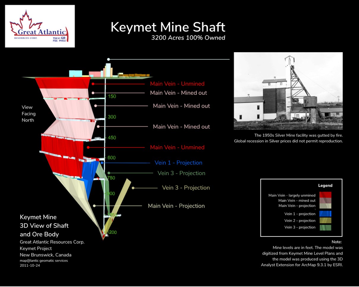 Past-Producing Keymet Silver Mine: The past-producing Keymet Silver Mine was developed on polymetallic veins and operated during the mid 1950s (New Brunswick Department of Natural Resources and Energy Development Mineral Occurrence Database, Reference No. 368). The New Brunswick Mineral Occurrence Database files report development to the 900-foot level (274 meters) and production during 1954-1956 of approximately 59,000 tons grading on average 33.9 g/t silver, 2.59% zinc, 2.44% lead and 0.25% copper. Operation ceased during 1956 following a surface fire.