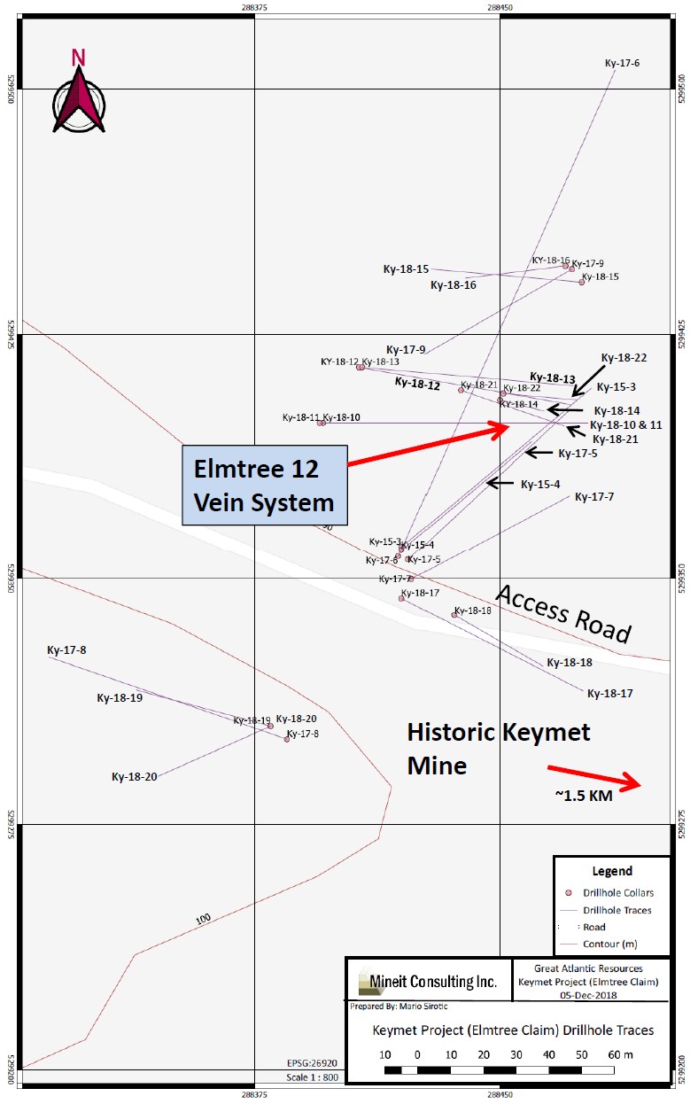 Elmtree Silver Mine: Workings at the historic Elmtree Silver Mine are reported to date back to the late 1950 (also referred to as the Elmtree 13 mineral occurrence - New Brunswick Department of Natural Resources and Energy Development Mineral Occurrence Database, Reference No. 901). This includes a shaft reported to a depth of approximately 20 meters, reported to be developed on a vein with quartz, calcite and sulfides reported to be 1.8-2.4 metres wide. Reported assays at that time included an assay of 33.75 oz/ton silver. Great Atlantic completed three drill holes in this general area during 2015 and 2023 and located the historic shaft. A 0.51-meters long (core length) sample from hole Ky-15-01 returned 9.53% zinc, 9.01% lead and 66 g/t silver.