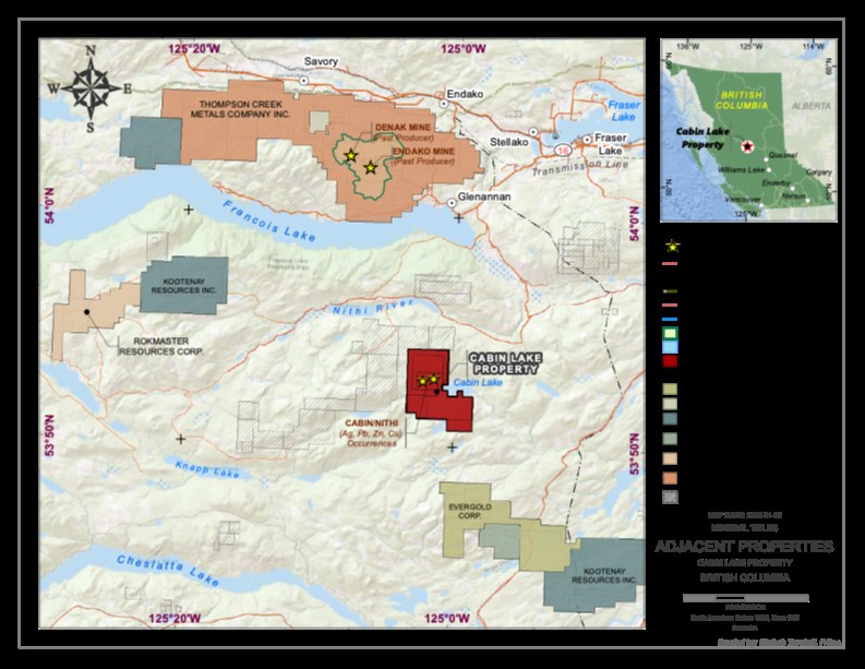 The Cabin Lake Project is comprised of six contiguous mineral claims totaling approximately 2,363 hectares in central British Columbia's Omineca Mining District. Cabin Lake is a polymetallic system prospective for zinc, lead, copper, molybdenum and silver, with multiple historical showings and a 600 metre by 1,000 metre target footprint identified through prior exploration work.