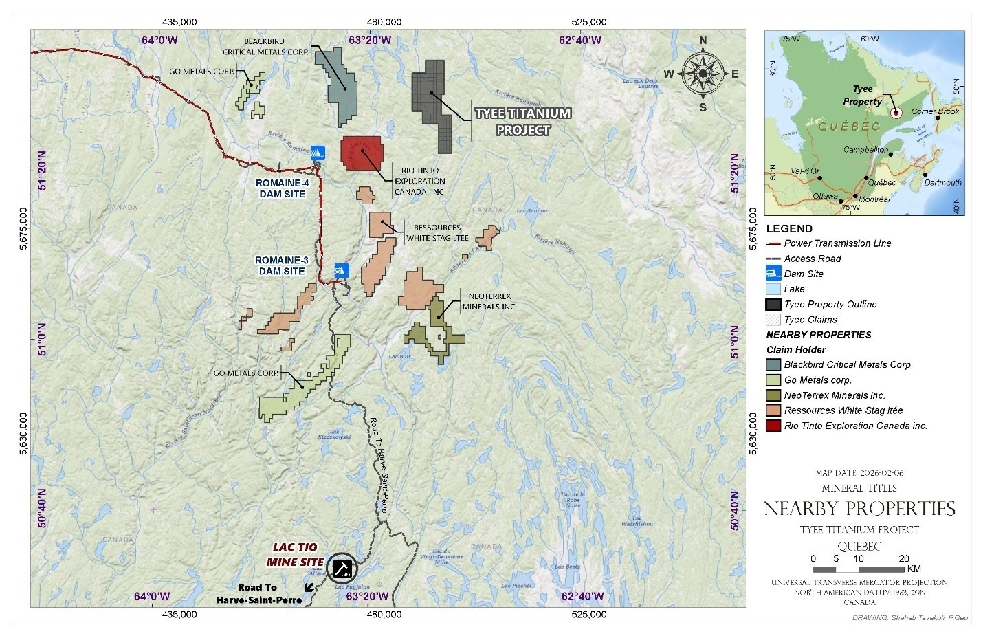 Tyee includes the Big TiO, NS Trend and East Nugget targets, which have been the subject of historical geophysical surveys and surface sampling and are prospective for titanium and vanadium mineralization associated with layered anorthosite-hosted systems.