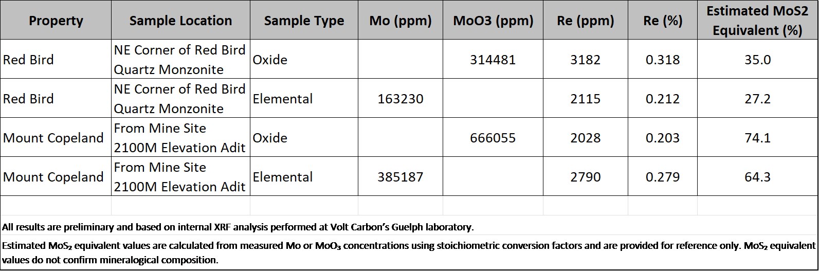 Internal XRF analysis indicates that Mount Copeland material returned approximately 2,790 ppm rhenium in elemental analysis. Red Bird material returned approximately 3,182 ppm rhenium in oxide analysis and 2,115 ppm rhenium in elemental analysis of selected separated samples.