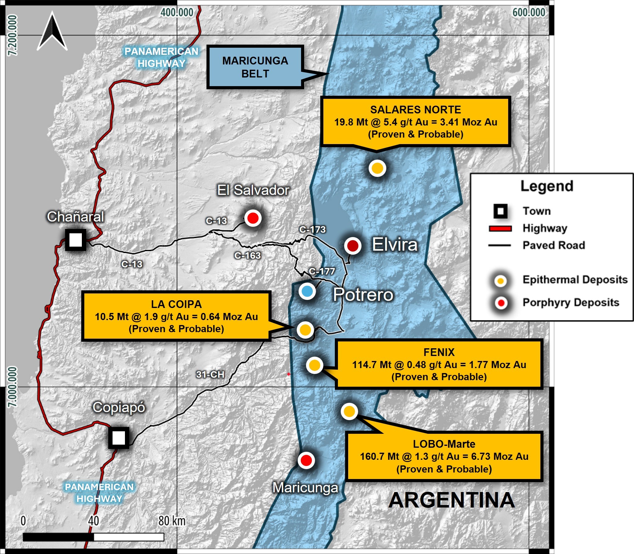 *Adjacent property Mineral Resource and Mineral Reserve estimates shown in Figure 1, including those for Salares Norte, Fenix Gold, La Coipa and Lobo-Marte, are derived from publicly available disclosures prepared by the respective owners in accordance with applicable securities regulations, including: 1Gold Fields Limited, Salares Norte Technical Report Summary (effective 31 December 2024); 2Rio2 Limited, NI 43-101 Feasibility Study Technical Report for the Fenix Gold Project (effective 16 October 2023); and 3Kinross Gold Corporation, La Coipa and Lobo-Marte Mines Mineral Reserve and Resource Statement as at 31 December 2024, prepared in accordance with CIM Definition Standards. Such information is not necessarily indicative of mineralization on the Company's Elvira project.