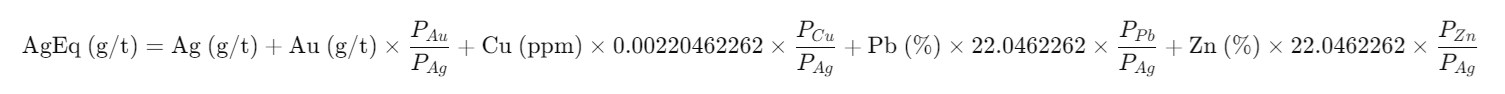 Metal values used in AgEq calculations are from the 200-day moving average values from 2/6/2026, and all values are in USD. PAu= $124.5/g, PAg= $1.58/g, PCu= $4.9/lbs, PPb=$0.90/lbs, PZn=$1.11/lbs, 0.00220462262 = grams-to-pounds conversion factor, 22.0462262 = pounds per metric tonne for 1% metal.