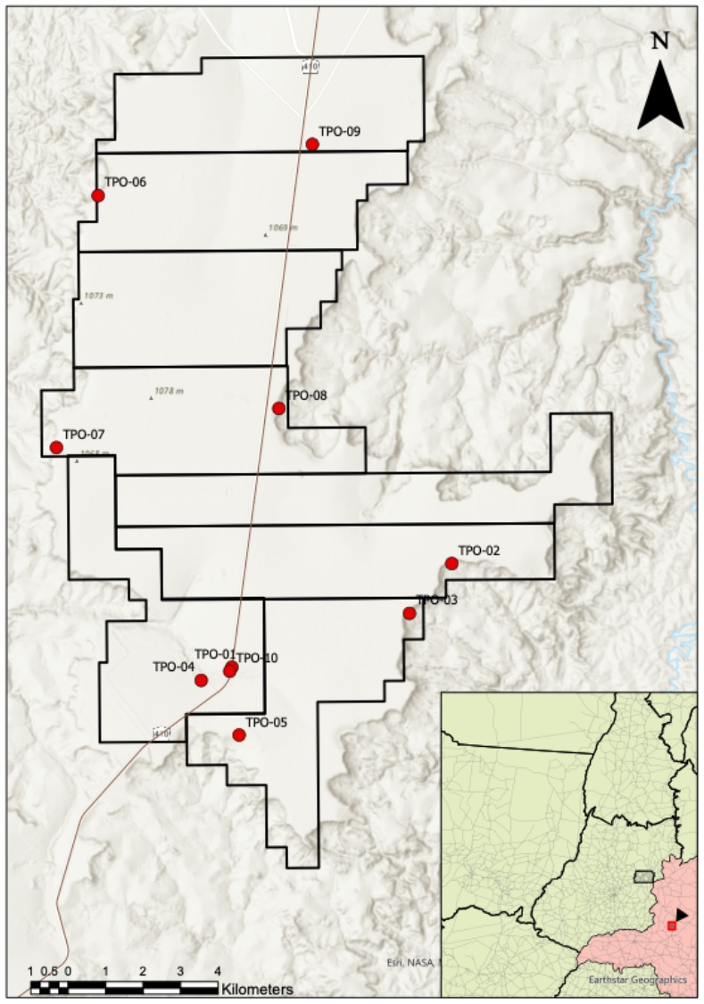 The program targets areas of kamafugite occurrence at depth across the property, including lower topographic positions associated with ferruginous duricrust development, which are characteristic of a mature lateritic weathering profile. Drill hole locations, the claim boundary, and the project area are shown in Figure 1.