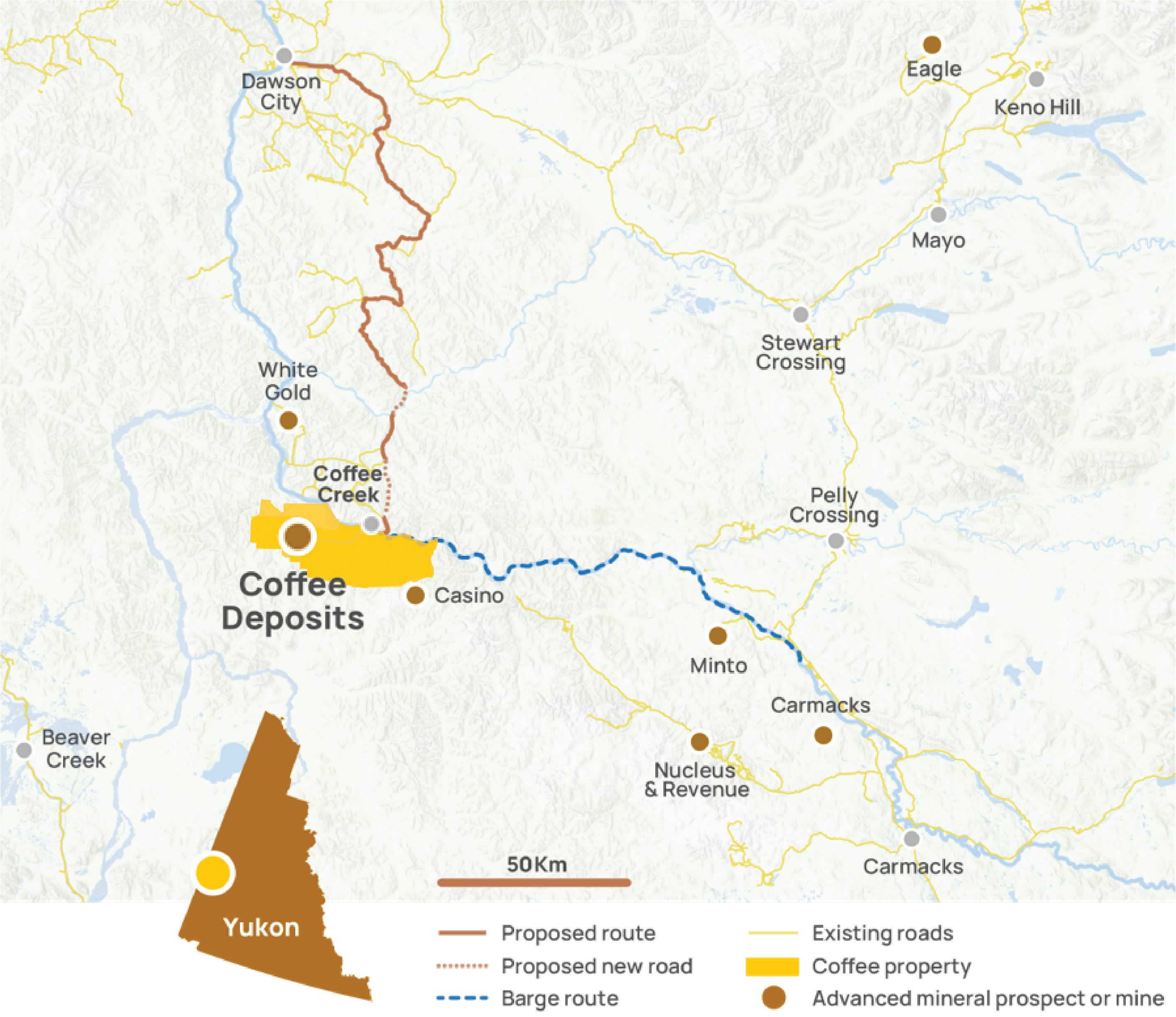 The Coffee Gold Project is located approximately 130 km south of Dawson in Canada's Yukon Territory (Figure 1). The project is situated within the prolific Yukon- Tanana Terrane (YTT), and within the wider Tintina Gold Province, which hosts numerous multi-million-ounce deposits and producing mines including Kinross' Fort Knox Mine and Snowline's Valley deposit. The lack of glaciation in the Yukon has allowed for the preservation of extensive oxide ore deposits such as Coffee and the nearby Casino copper-gold deposit.