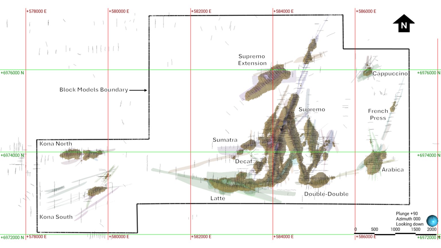 Figure 2 - The Coffee Deposit with principal resource zones, drilling and pit shells