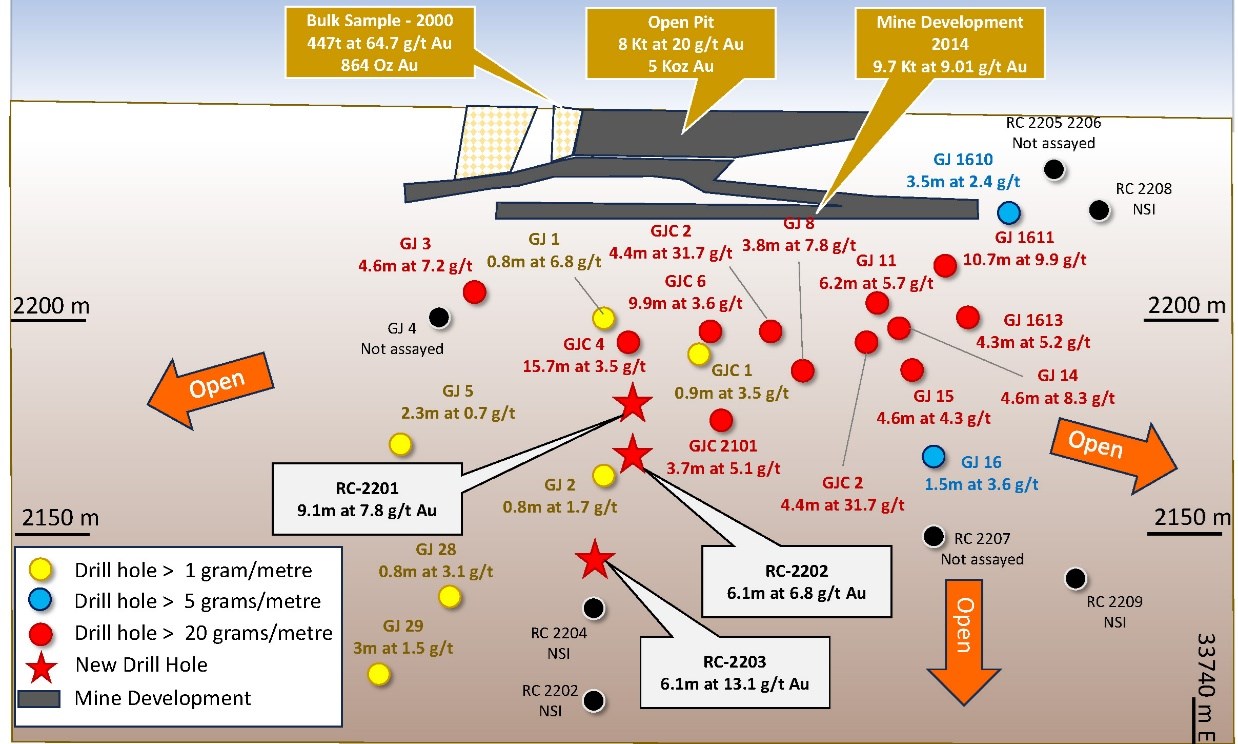 • Drillhole # 2203 - 6.1 metres at 13.1 g/t Au from 111.3 metres depth (6.0 m true width) (Including 3.0 metres at 17.3 g/t Au)