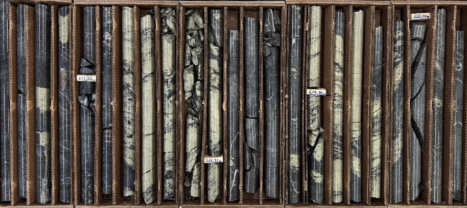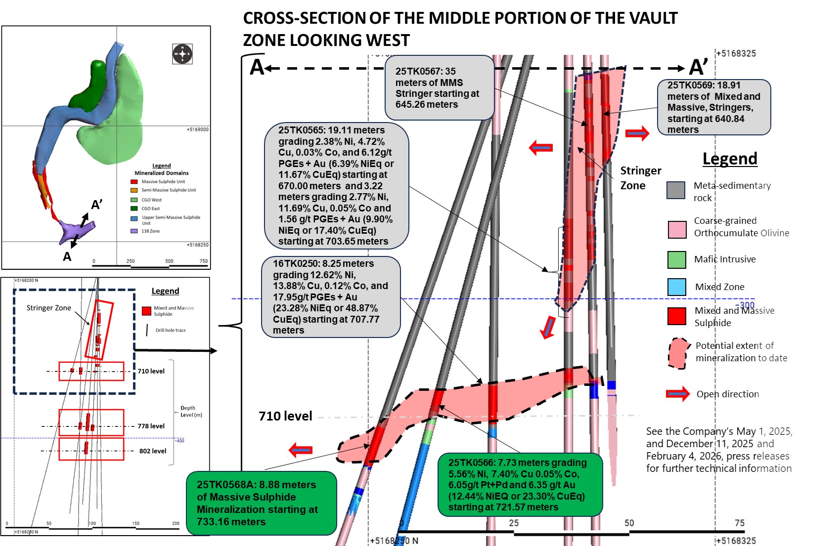 New drill hole 25TK0568 intercepted 10.35 meters of MSU/MMS interlayered with disseminated sulphide starting at 611.57 meters (assays pending; see Figures 1 and 2). This newly identified mineralized zone occurs at approximately the 610-meter level, about 100 meters above discovery hole 16TK0250, which identified MSU accumulation on the 710-meter level. Together, these results support the interpretation of the Vault Zone as a stacked mineralized system and confirm a fourth mineralized level within the broader Vault Zone.