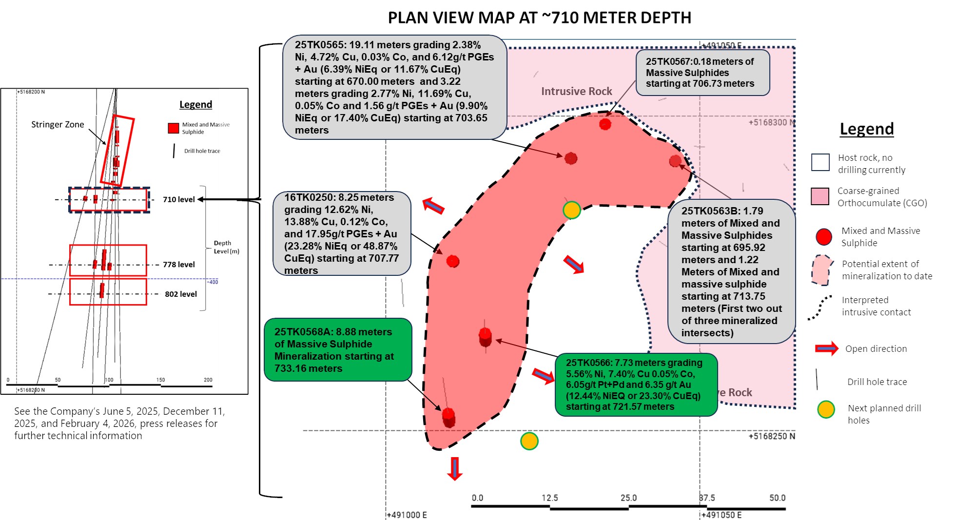 Drill hole 25TK0566 is an approximate 12-meter step out to the south from discovery hole 16TK0250, which previously intercepted 8.25 meters (from 707.77 to 716.02 meters) grading 12.62% Ni, 13.88% Cu, 0.12% Co, and 11.78 g/t Pt+Pd and 6.17 g/t Au (see the Company's May 1, 2025, press release). Drill hole 25TK0566 intercepted 7.73 meters of MMS/MSU grading 5.56% Ni, 7.40% Cu, 0.05% Co, 6.05 g/t Pt+Pd, and 6.35 g/t Au (12.44% NiEq or 23.30% CuEq) starting at 721.57 meters. (See Table 1 and Figures 4 and 5).