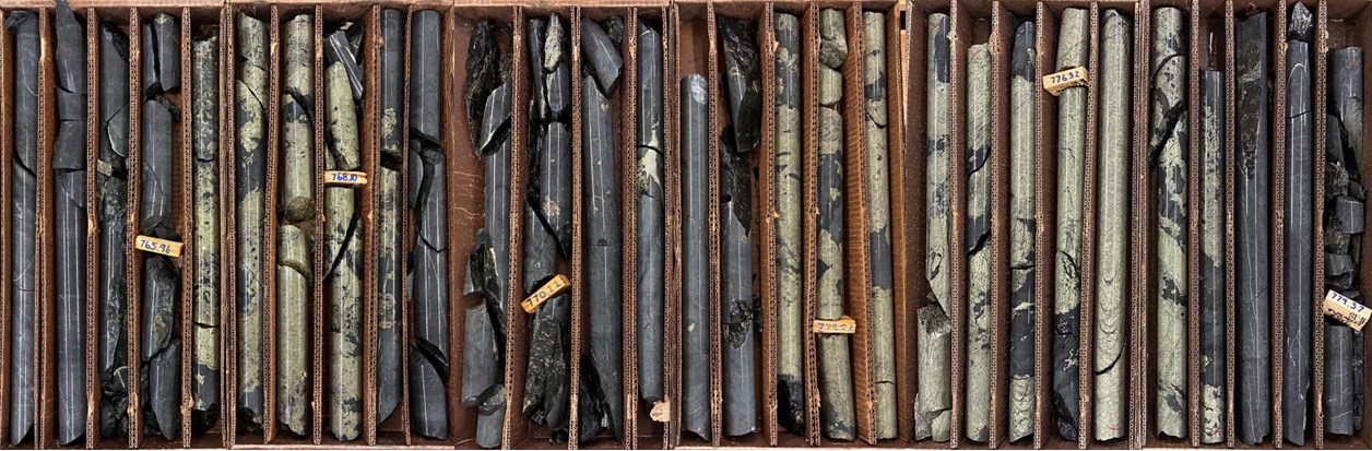 New drill hole 25TK0569A targeted the 778-meter level mineralization north of discovery hole 25TK0563. The hole, drilled approximately 12 meters north of previously reported drill hole 25TK0563, intercepted two mineralized intervals in the Vault Zone. At 694.03 meters, the hole intercepted 5.49 meters of MSU/MMS, and starting at 766.26 meters, 10.3 meters of MSU/MMS intercalated with disseminated sulphide mineralization (See Figures 6 and 7; assays pending). These results support continued follow-up drilling in this part of the Vault Zone.