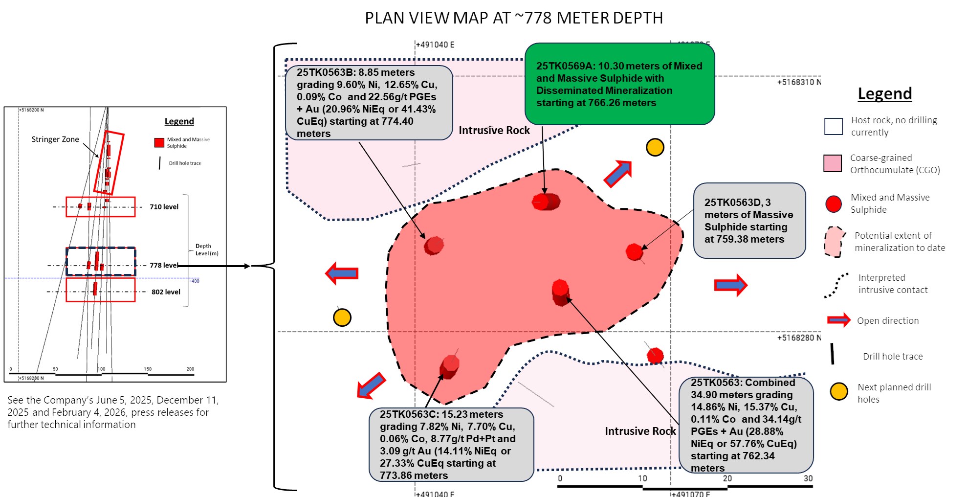 - Drill hole 25TK0566 intercepted 7.73 meters of Massive Sulphide Unit ("MSU") and Mixed Massive Sulphides ("MMS") grading 5.56% Ni, 7.40% Cu, 0.05% Co, 6.05 g/t Pt+Pd, and 6.35 g/t Au (12.44% NiEq or 23.30% CuEq) starting at 721.57 meters.