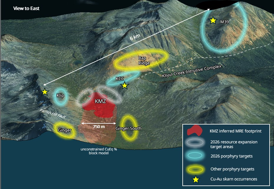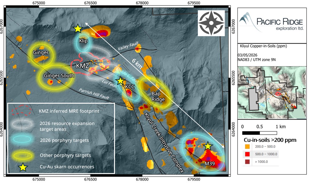 • Kliyul: The Kliyul Main Zone ("KMZ"), just one target area at Kliyul, hosts 2.42 billion pounds copper equivalent ("CuEq") (see Table 1) or 5.7 million ounces gold equivalent ("AuEq") (see Table 2) in the Inferred Mineral Resource category. 2025 drilling at KMZ intersected 289.0 m of 0.77% CuEq* (0.26% copper, 0.75 g/t gold, and 1.54 g/t silver) (see news release dated November 18, 2025). Pacific Ridge will focus on resource expansion at KMZ and testing other high-priority porphyry targets at Kliyul this year.