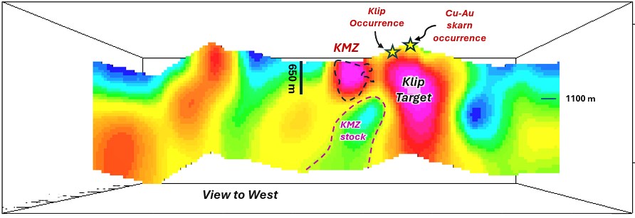 Resource expansion targets include drilling within the tilt derivative ("TDR") aeromagnetic footprint to the northeast of KMZ Mineral Resource Estimate ("MRE") footprint as well as a strong resistivity gradient within a magmatic corridor of favourable alteration and early dioritic intrusive rocks at the southeastern extent of the MRE footprint (see Figures 2 and 3). Copper-gold mineralization at KMZ is associated with the TDR aeromagnetic footprint, as well as resistivity gradients.