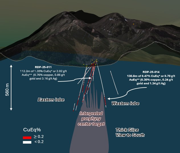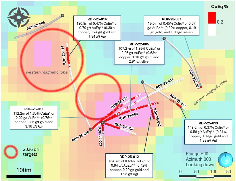 • RDP: 2025 drilling at the Day target, one of several target areas at RDP, returned one of B.C.'s best porphyry copper-gold intervals that year. Drill hole RDP-25-011 intersected 112.2m of 1.35% CuEq* (0.76% copper, 0.86 g/t gold, and 3.16 g/t silver) (see news release dated October 23, 2025). The Company plans to target the interpreted porphyry centre at Day and further define the western magnetic lobe discovery this year.