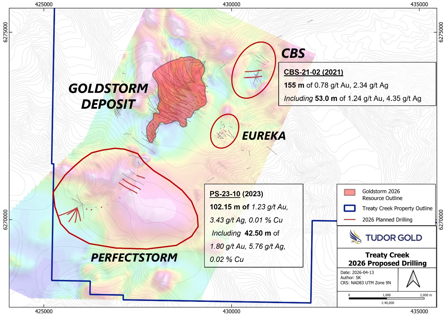 Tudor's 2026 Treaty Creek Exploration Program has been planned to follow up on its gold discoveries near Treaty Creek's Goldstorm deposit, which hosts the project's Mineral Resources. Phase One of the program will follow up on drill results from 2021 and 2022 at the CBS Zone, where drill hole CBS-21-02 encountered 0.78 g/t gold and 2.34 g/t silver over 155.0 meters, including 53.0 meters grading 1.24 g/t gold and 4.35 g/t silver. Initially 2,000 meters of drilling is planned for the CBS Zone, with additional drilling dependent on success. The CBS Zone is at a lower elevation than the other zones identified to date at Treaty Creek and can be drilled both earlier and later in the exploration season than the other known zones.