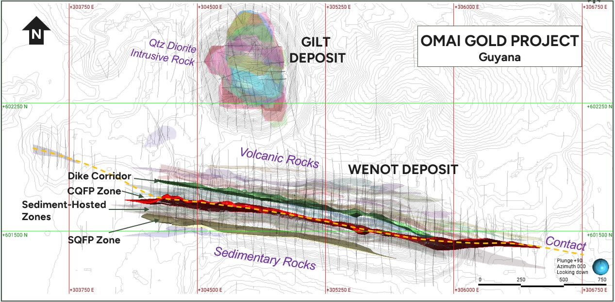 Gilt is an orogenic gold deposit hosted predominantly within a 500 m by 300 m quartz diorite intrusion known as the "Omai Stock". The mineralized zones extend into the surrounding volcanic sequence as evidenced by the detailed drilling in the upper part of the deposit that was previously mined. The upper 250 m of the deposit produced 2.4 million ounces of gold (1993-2005). The Gilt deposit is located approximately 500 m north of the Wenot gold deposit. Gilt is an underground deposit, likely to be accessed by a ramp from surface, with its shallowest point relatively shallow at a depth of 275 m. Gilt has been drilled to a maximum depth of 960 m and is open at depth.