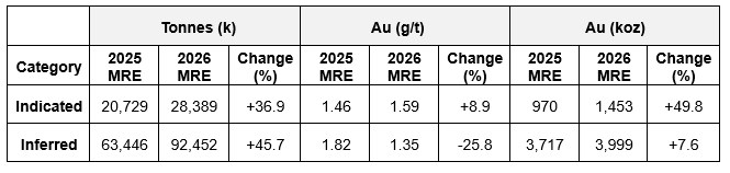 - 1,453,000 oz of gold in 28.4 Mt (Indicated), a 49.8% increase in ounces (+483,000 oz) over the August 2025 MRE1