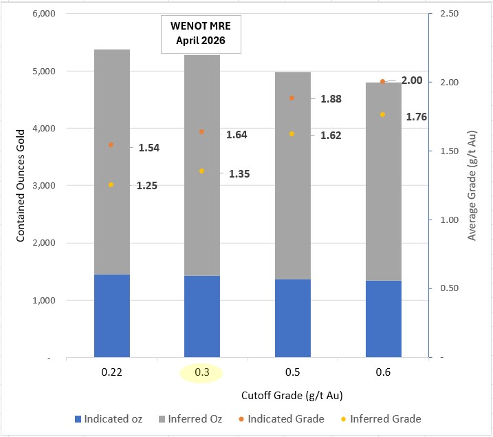 The impact of cut-off grade on the Wenot Mineral Resource Estimate size and grades is shown in Figure 3 below, with selective data provided in Table 4. Additional sensitivity data for Wenot is provided in Table 6. The cut-off grade for Wenot was maintained at 0.30 g/t Au, consistent with the 2025 MRE, despite a significantly higher spot gold price. A higher gold price assumes that a lower gold grade can normally be economically extracted and processed. The gold price assumption for the current MRE is $3,000/oz versus $2,500/oz for the August 2025 MRE. Figure 3 shows that even at a higher cut-off grade of 0.5 g/t Au, the number of ounces in the Indicated MRE is reduced only slightly to 1.37 Moz, but is at a higher average grade of 1.88 g/t Au. Further, the Inferred MRE at the same higher cut-off gives 3.6 Moz at a higher grade of 1.62 g/t Au. The overall impact of raising the cut-off from 0.3 g/t Au (the base case) to 0.5 g/t Au is less than a 6% reduction in the number of ounces in the overall MRE; however, the grade of the Indicated MRE increases by 14.6% and the grade of the Inferred MRE increases by 20%.
