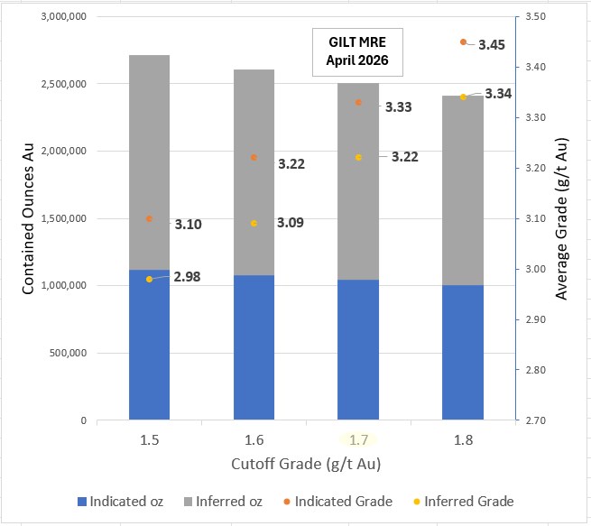 This updated study shows an overall increase to the Gilt MRE. Most of this impact was in the Inferred category that increased 120.3% or by 800,000 ounces. Grades decreased by 3.9% to 3.22 g/t Au from 3.35 g/t Au. The increase in the Inferred MRE resulted from the QP re-examining data from the upper part of the Gilt deposit, which was mined out as well as the drilling data at depth on the deposit. This showed that the gold zones within the Gilt intrusion typically extend into the surrounding volcanic rocks. Similarly, the new drilling of the Gilt deposit at depth shows the gold mineralized zones extending into the adjacent volcanic rocks. The modelling of the gold zones integrated these extensions and were the major contributor to the increase in the Gilt Inferred MRE.