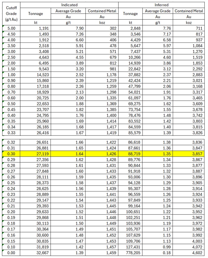 - Increased gold price assumption to $3,000/oz from $2,500/oz at the same cut-off of 0.30 g/t Au