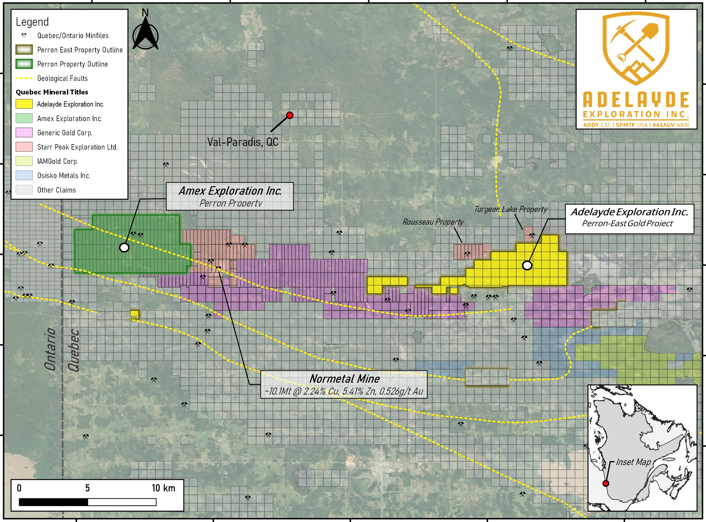 Vancouver, British Columbia--(Newsfile Corp. - April 15, 2026) - Adelayde Exploration Inc. (CSE: ADDY) (OTCID: SPMTF) (WKN: A41AGV) (the "Company" or "Adelayde") is pleased to announce that the Company is formulating work plans for the 9,168-acre 'Perron-East Gold Project' in Quebec, located in the direct vicinity of Amex Exploration Inc. (AMX). On April 13, 2026, Amex Exploration Inc. announced a positive feasibility study for the development of the Perron gold mine (1). Highlights from Amex's feasibility study include; Gold production to average 147,000 oz per year over the 5 years of commercial Phase 1 production at an All in Sustaining Cost ("AISC") of USD$910/oz Au; Projected Post-Tax IRR of 114.6% and Post-Tax NPV5 of CAD$1.13 billion generated from a Cumulative Undiscounted Post-Tax Cash Flow of CAD$1.44 billion at an assumed gold price USD$3,500/oz. Management cautions that past results or discoveries on properties in proximity to Adelayde may not necessarily be indicative of the presence of mineralization on the Company's properties.