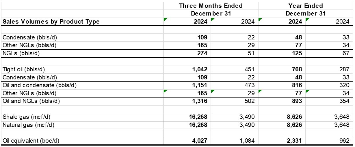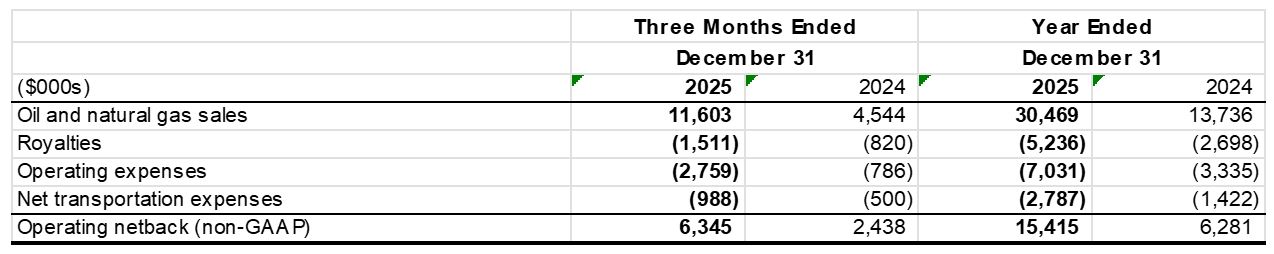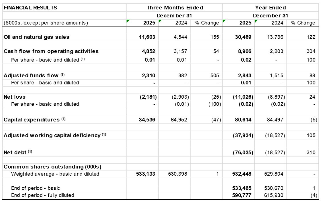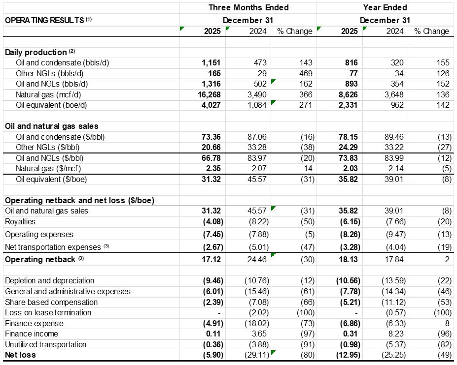 - Increased oil and natural gas production 271% to 4,027 boe/d in Q4 2025 from 1,084 boe/d in Q4 2024. Exit 2025 production was approximately 5,100 boe/d and exit Q1 2026 production was approximately 8,000 boe/d with the ramp up of new wells on production on its 5-19 pad at Two Rivers East.